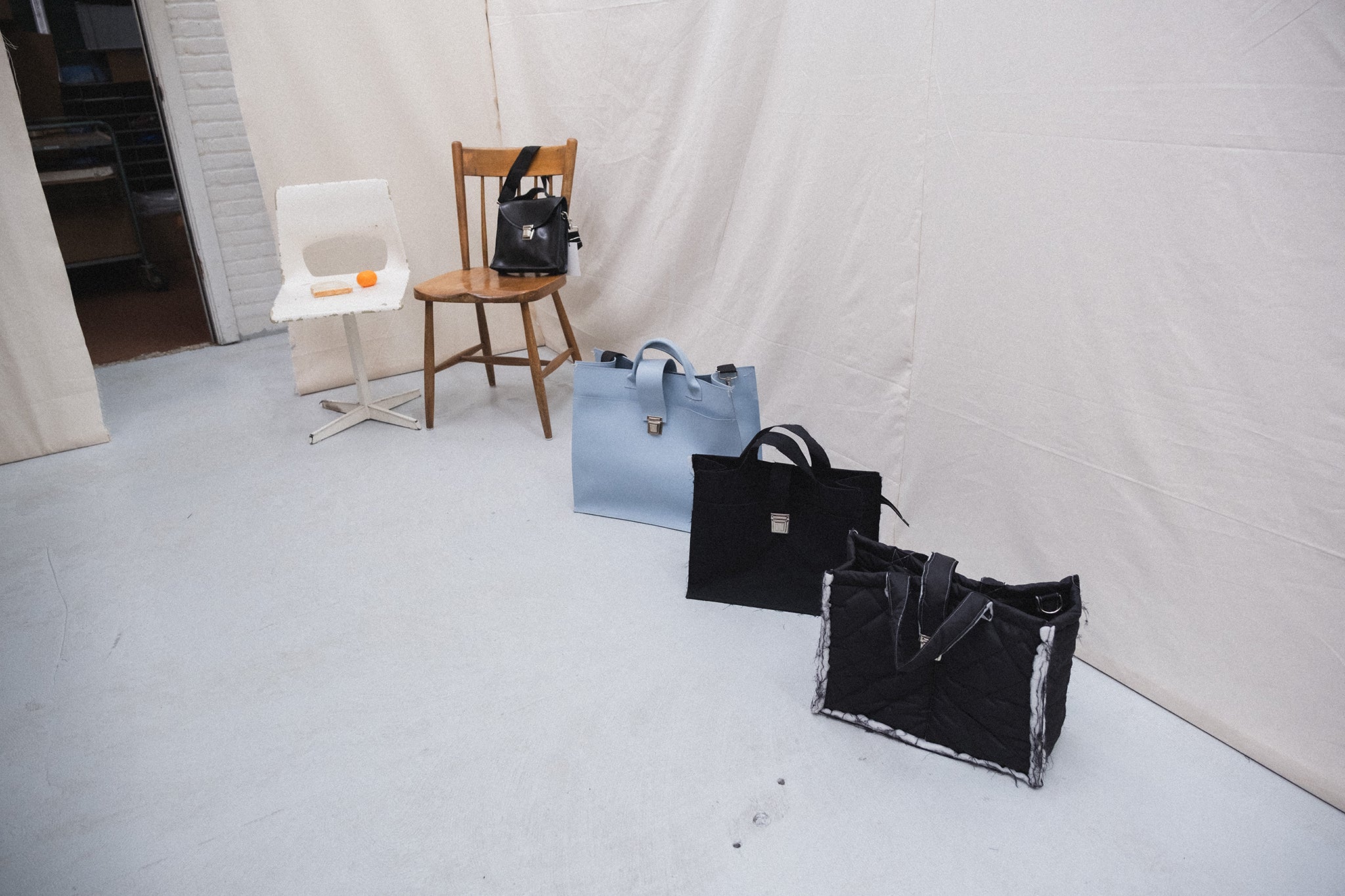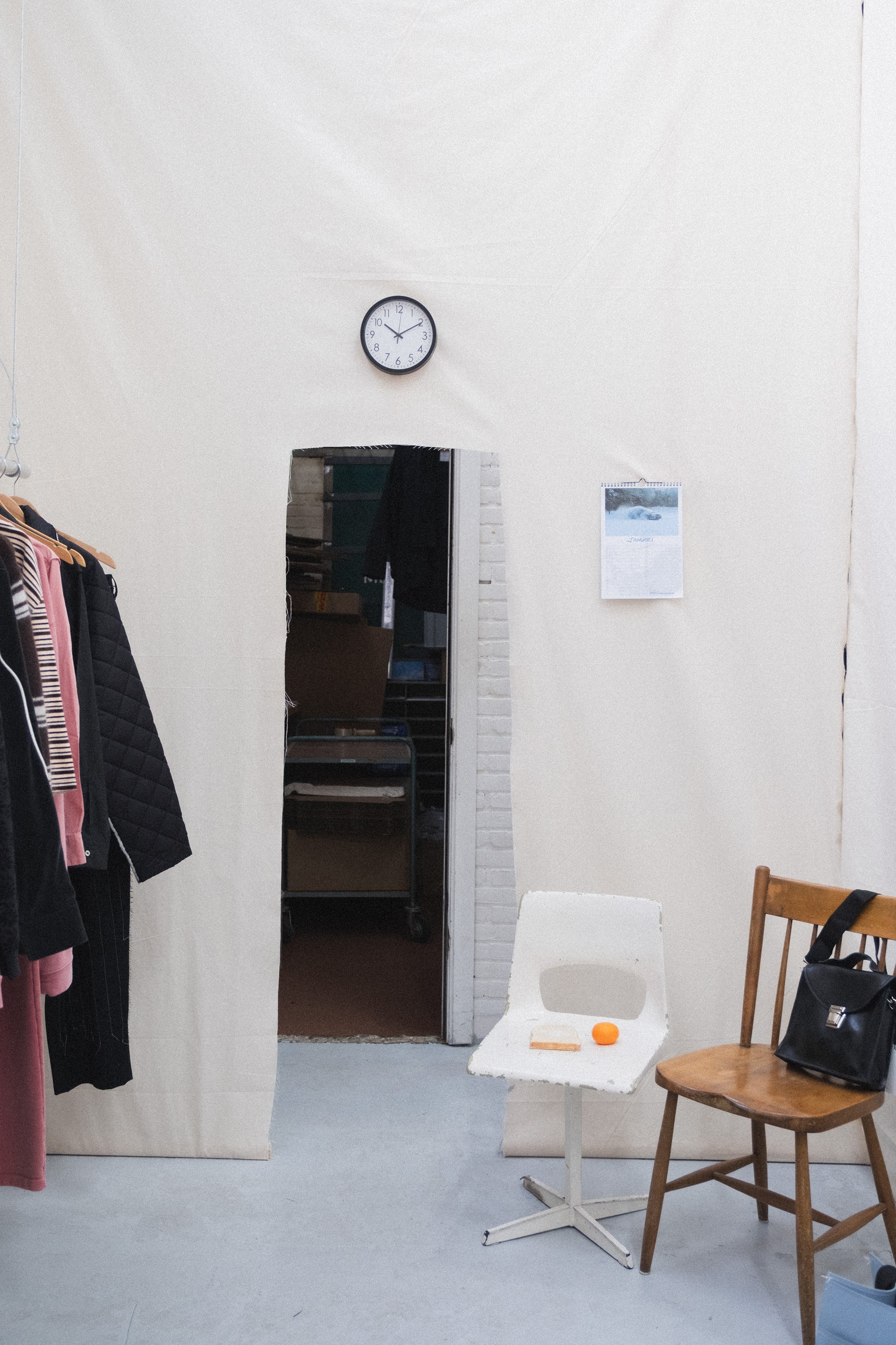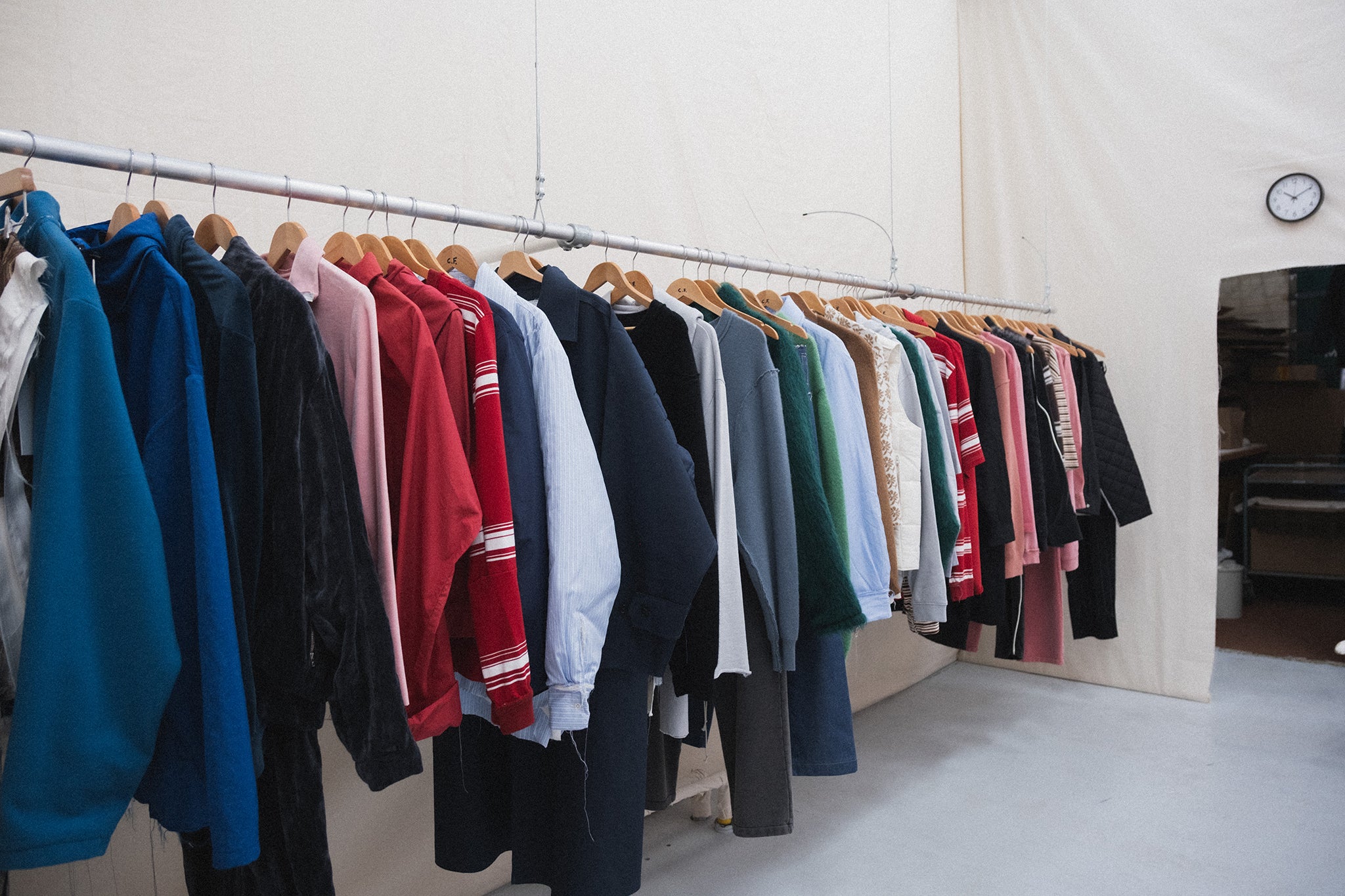 Tucked away in a neighborhood in West Amsterdam, in a charming former school, the Camiel Fortgens studio sits amongst other artists and designers. Ceramics, handmade furniture, and artwork fill the halls, the detritus common to all shared artistic studio spaces. Inside the studio is a tiny room, walls created out of muslin, with a mirror and a single long garment rack. This is the Camiel Fortgens shop, available for visitors to shop by appointment during studio hours. Incredibly charming and well worth the visit.