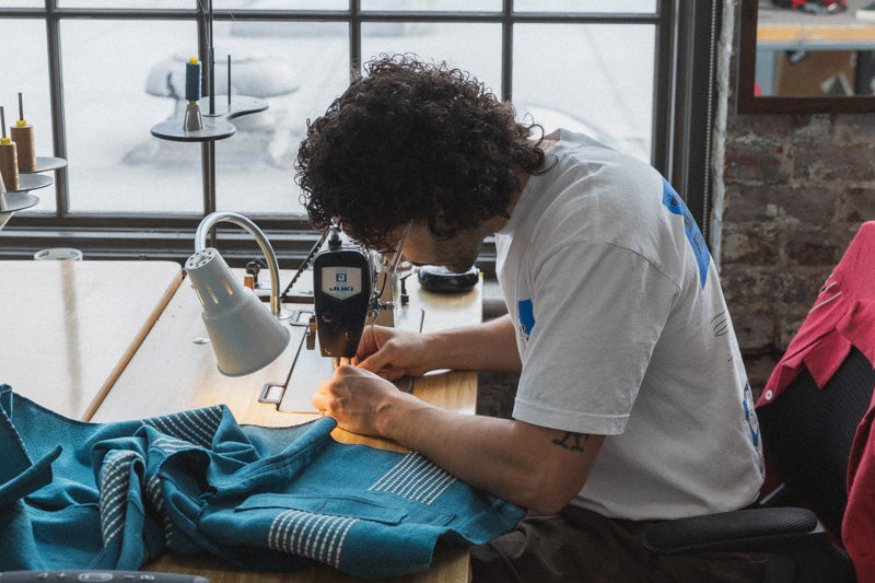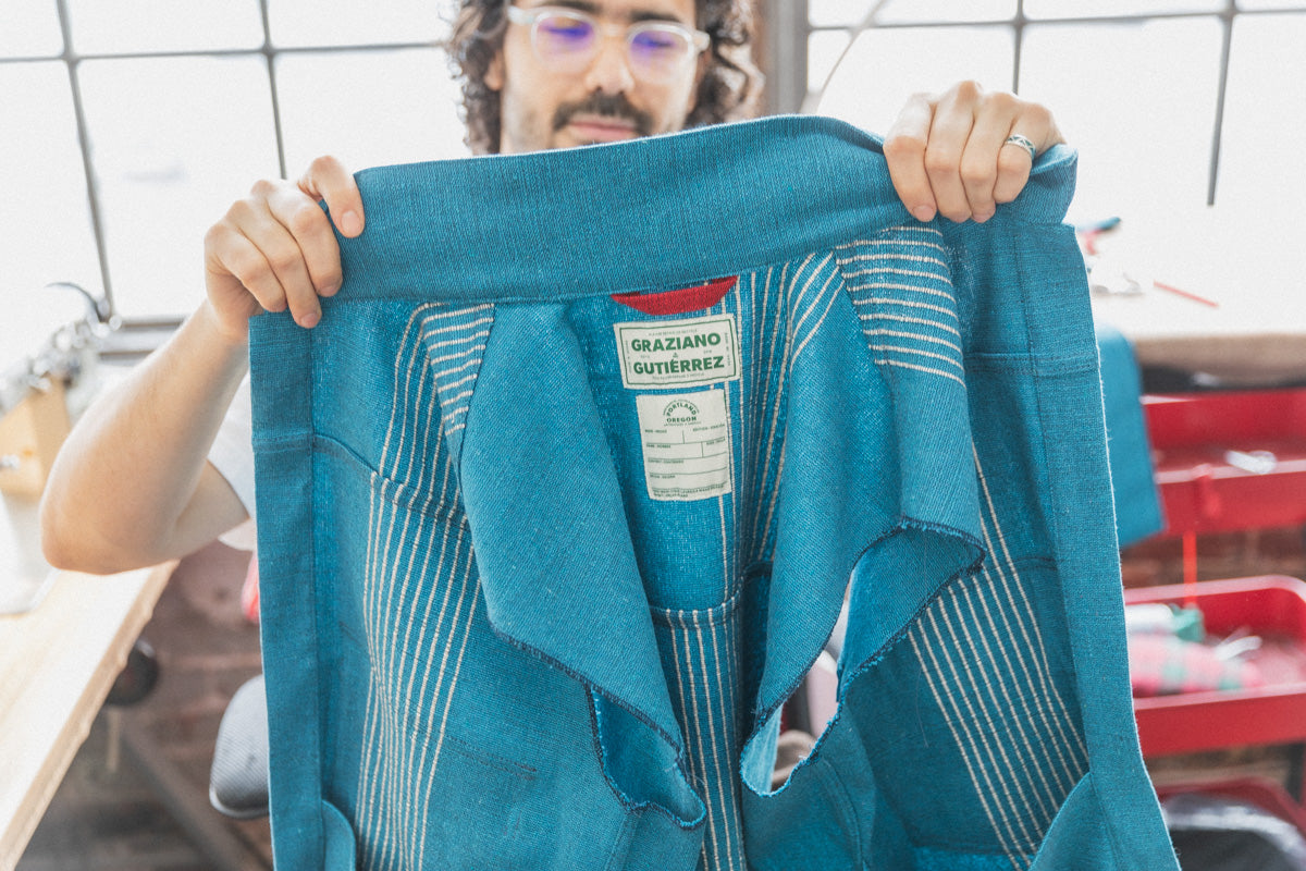 During another semester in college, he studied with a designer here in Portland named Lauren Winter (she no longer is based here in Portland, but she still sews!). Alejandro remembers, “She sewed and cut everything herself, which was inspiring, so I was like Ok! I’ll do that.” Despite the laborious process of designing, cutting, and sewing everything in house – Alejandro still does it all for Graziano & Gutierrez. If you have one of their pieces, you know it was sewn by Alejandro.