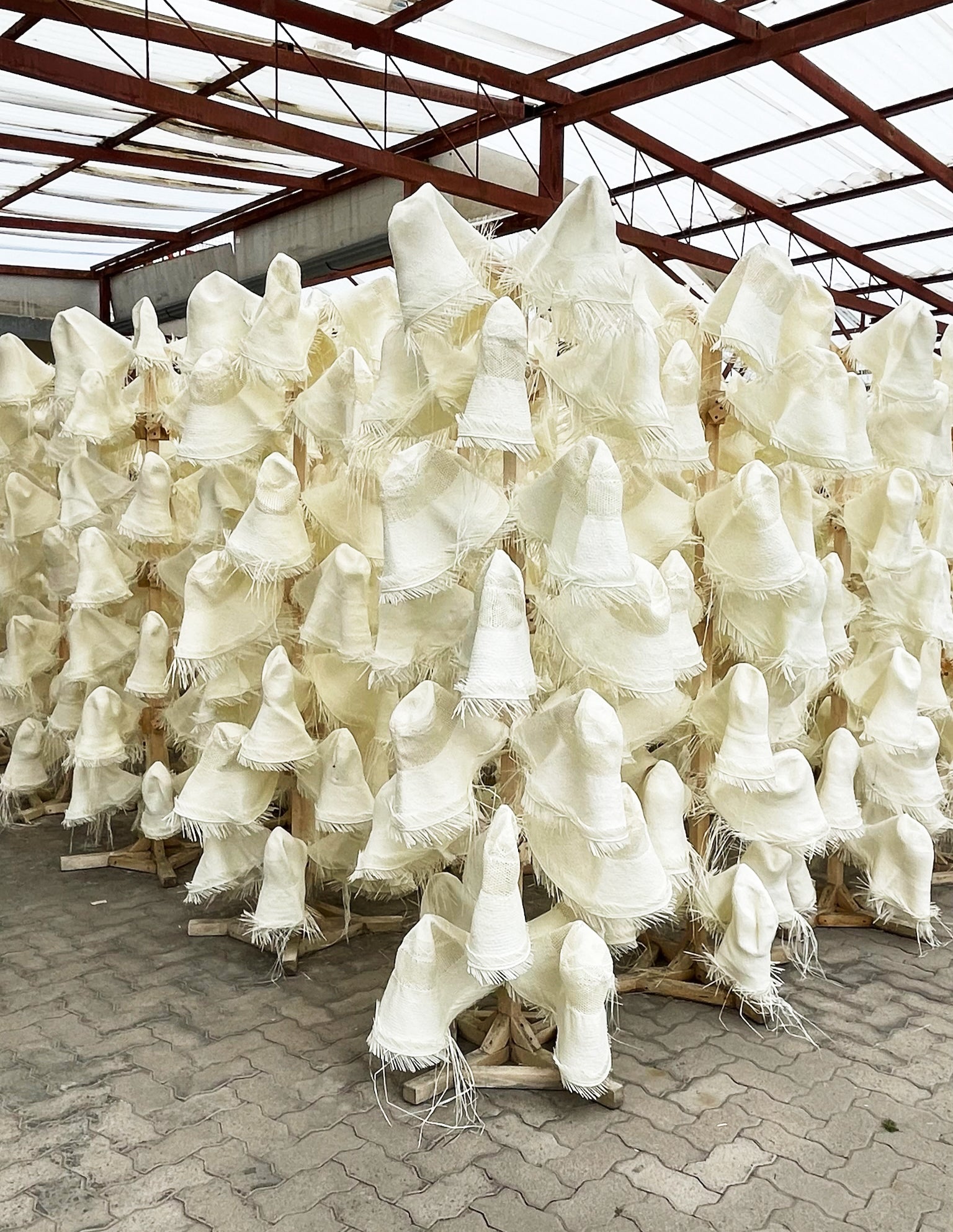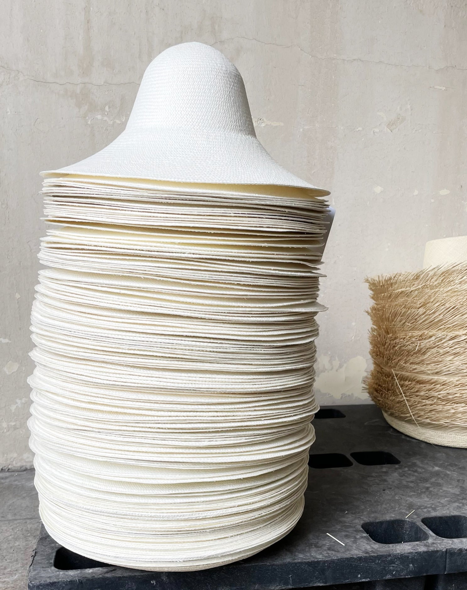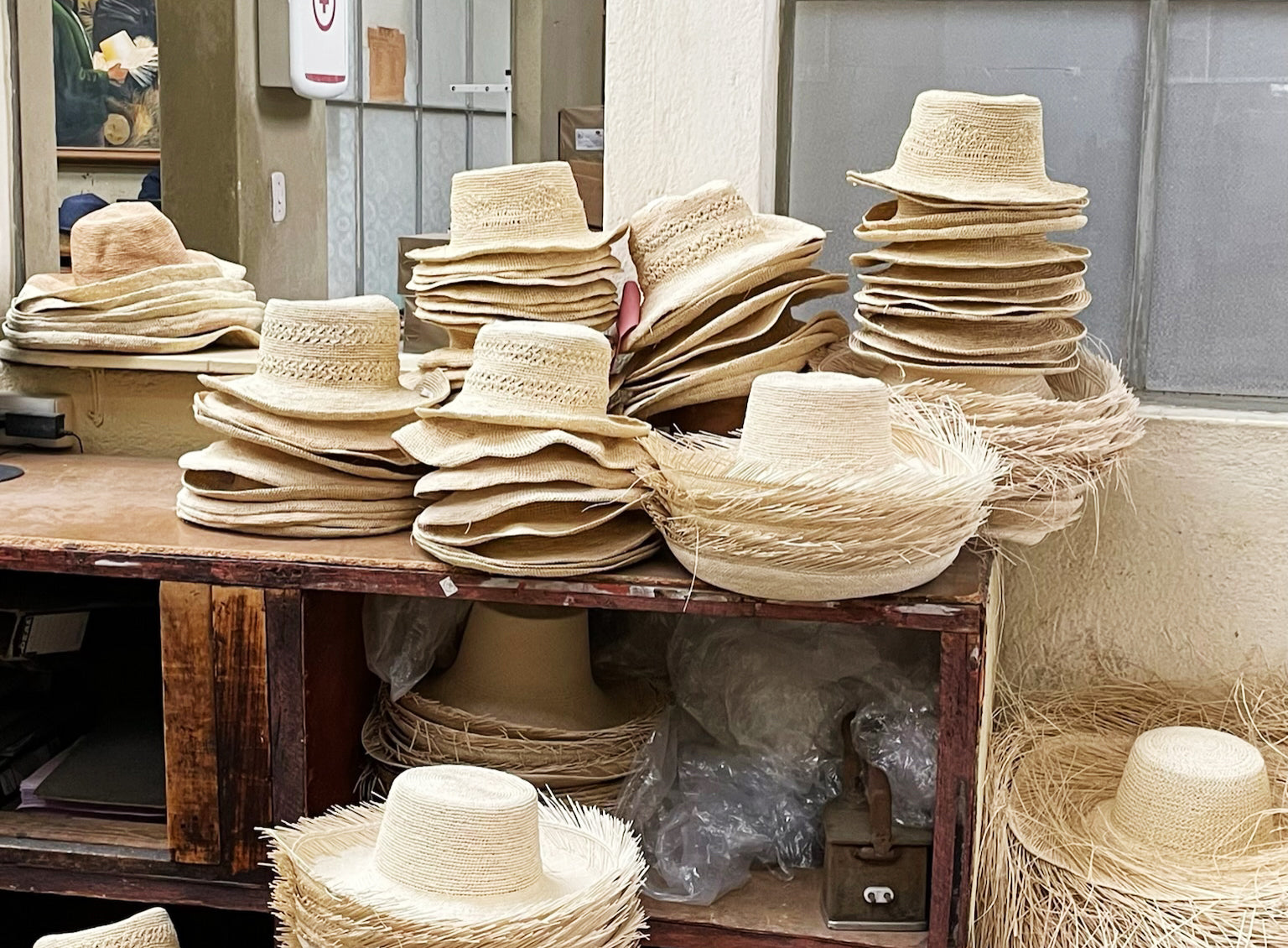 The local workshop sorts the hat bodies and processes them before they are made into hats or shipped as raw hat bodies to other hat makers. The straw is processed depending on the desired final product. Sunbleached straw comes in different variations, and when color is requested—environmentally friendly dyes are used. The excess straw is trimmed for the raw hat bodies to be ready for hand-blocking.
