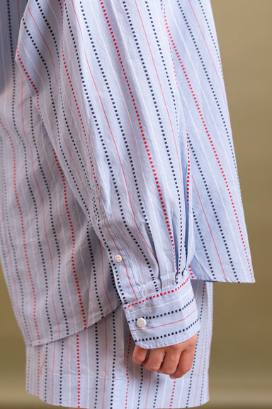 Elastic waist shorts with a false fly in a natural dyed raw silk fabric.