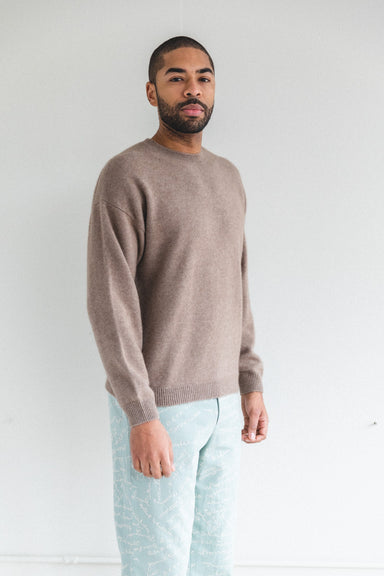 WOOL FELT YARN MESH KNIT MOCK NECK LONG PULLOVER IN DARK BROWN