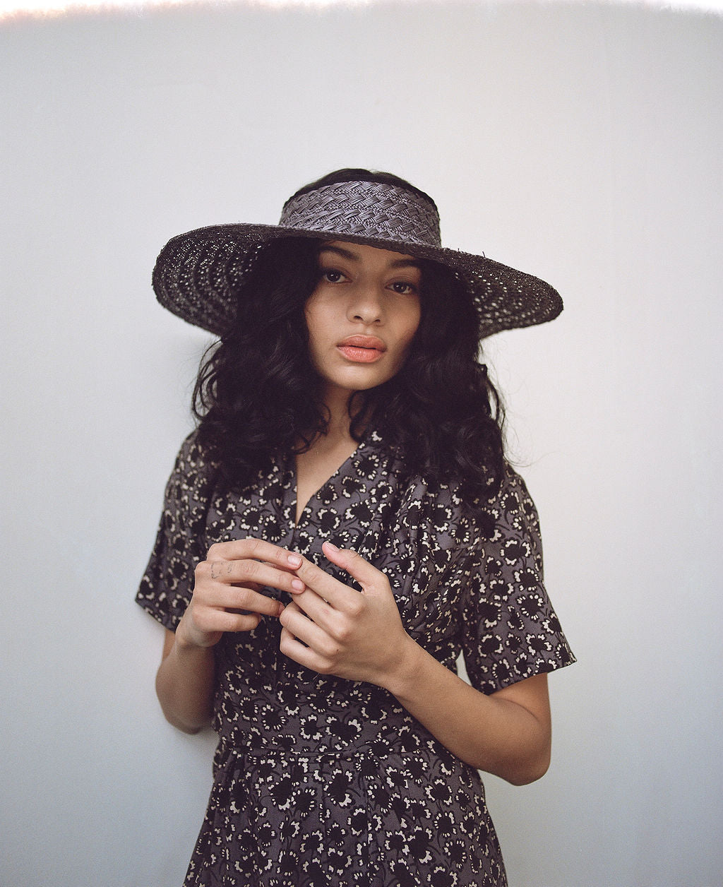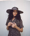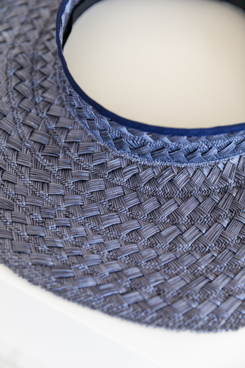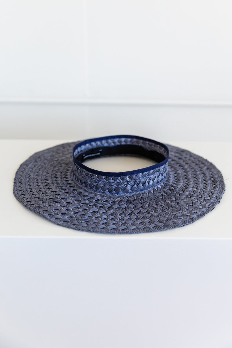 A charming topless style sunhat that is perfect for big hair or a bun. Available only in navy fancy weave straw.