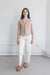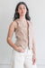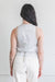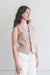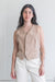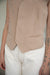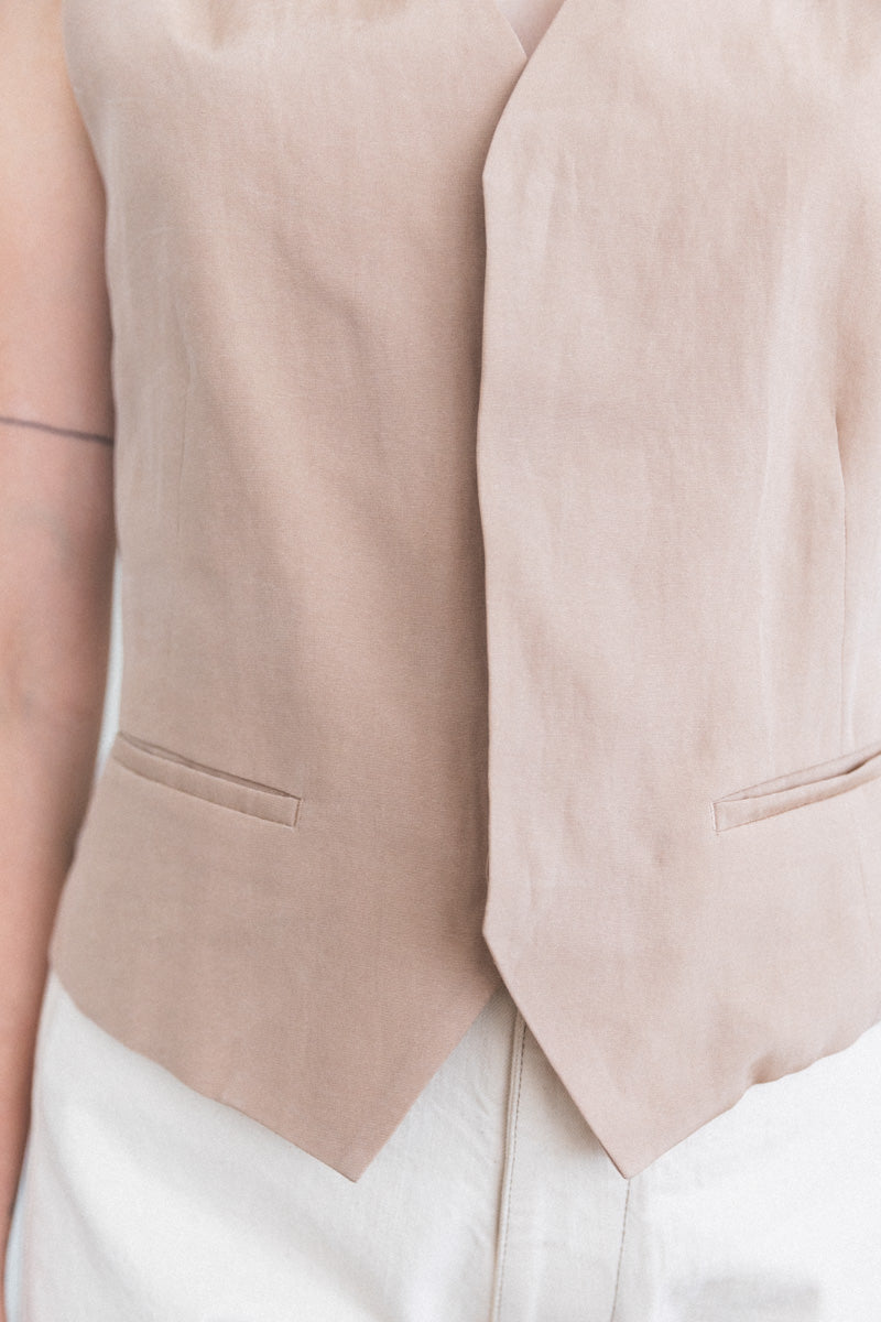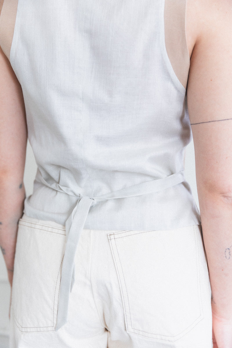 The Siwa Vest is inspired by masculine tailoring, but is intended to be a women's top worn on it's own. It has hidden buttons, transparent cotton ramie fabric at back, an adjustable belt at the front and back, cotton ramie lining on the front. It is made of a dry washi/cupro fabric, custom developed for Seya.