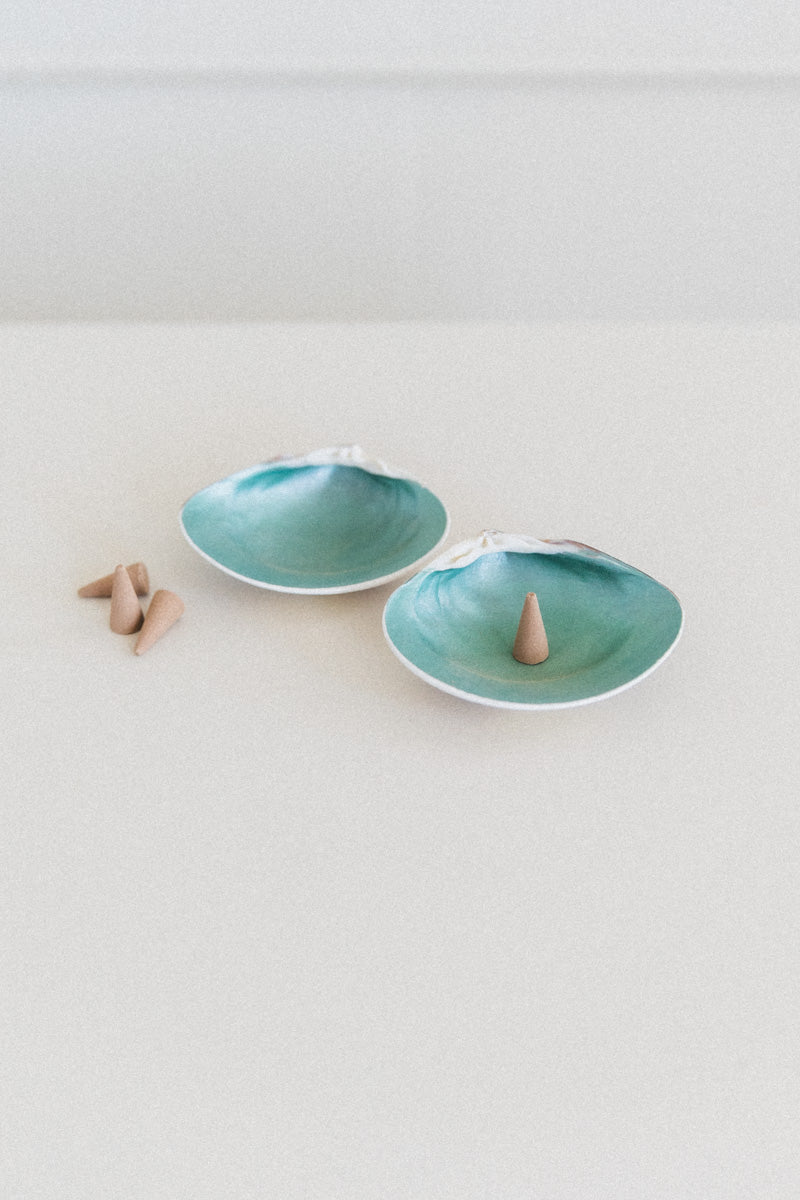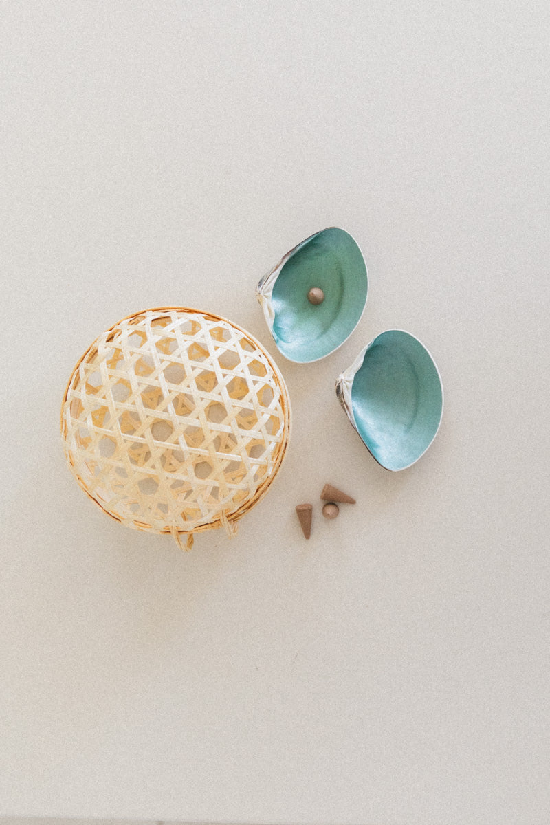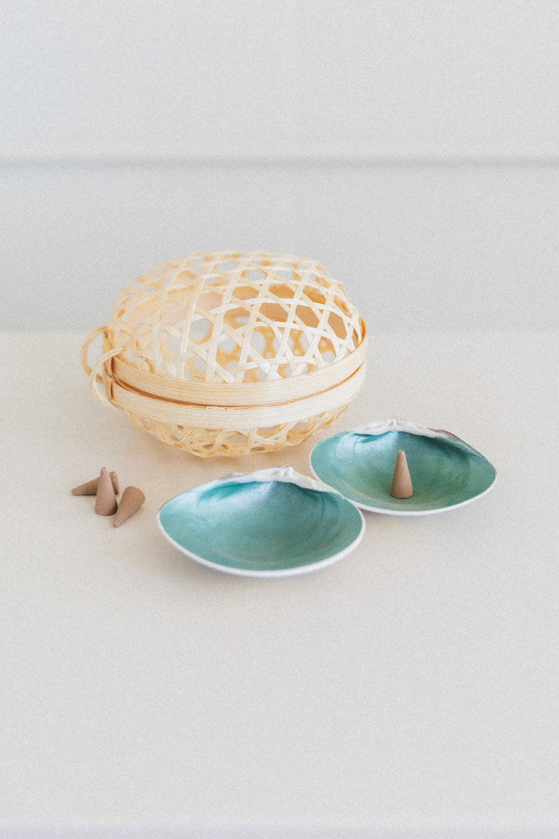 Original Seya incense with a hand painted shell holder. It comes with quite a few handmade incense cones and packaged in a handmade Japanese bamboo basket.