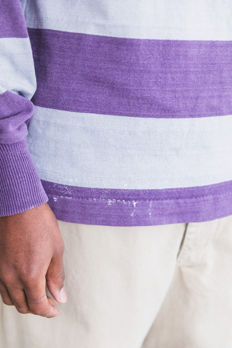 Vintage rugby shirt in a soft worn faded purple stripe with a few paint smudges.