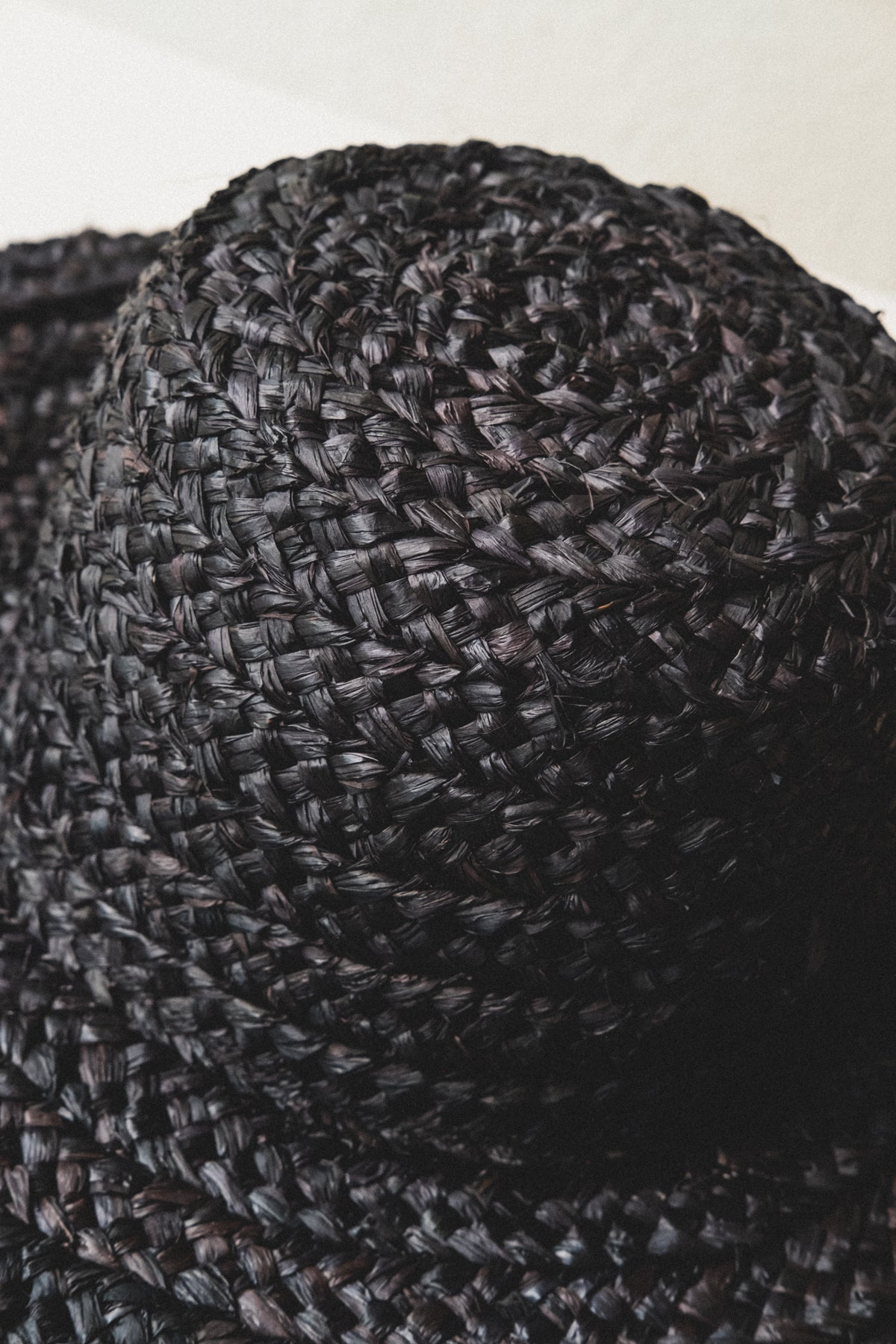A chunky braided raffia straw hat, with a tall straight crown and chunky medium length brim. Available in black or natural.