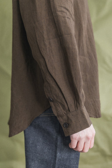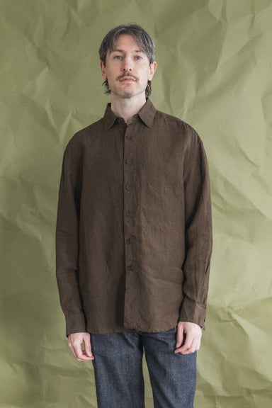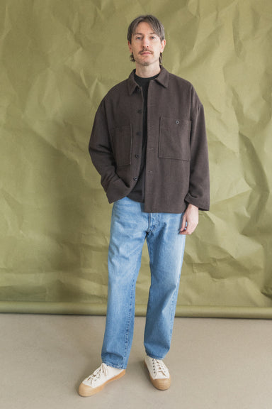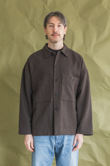 A fully lined boxy overshirt with dropped shoulder seam, lined chest patch pockets with button-through closure, interior patch pocket, and corozo buttons. A looser fit than the original Field Shirt, but both feature a larger neck opening, to nest cleanly when layered over a buttondown.