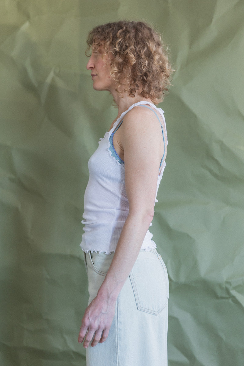 Made from finely-ribbed upcycled cotton, the Kinee tank is finished with purl merrow stitching, allowing for a modern take on a comfortable classic.
