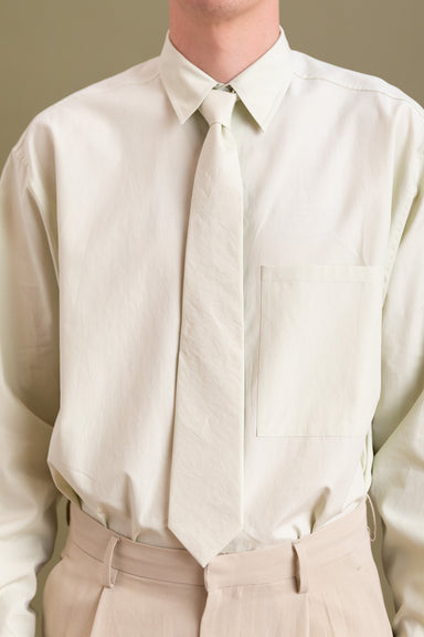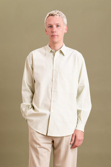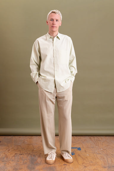 Jersey fabric knitted on a high-gauge machine using extra-long staple Pima cotton, processed and spun in its cotton state to maximize its volume. The fabric undergoes a treatment to minimize fuzz, resulting in a clean drape and a smooth, soft texture. Regular fit