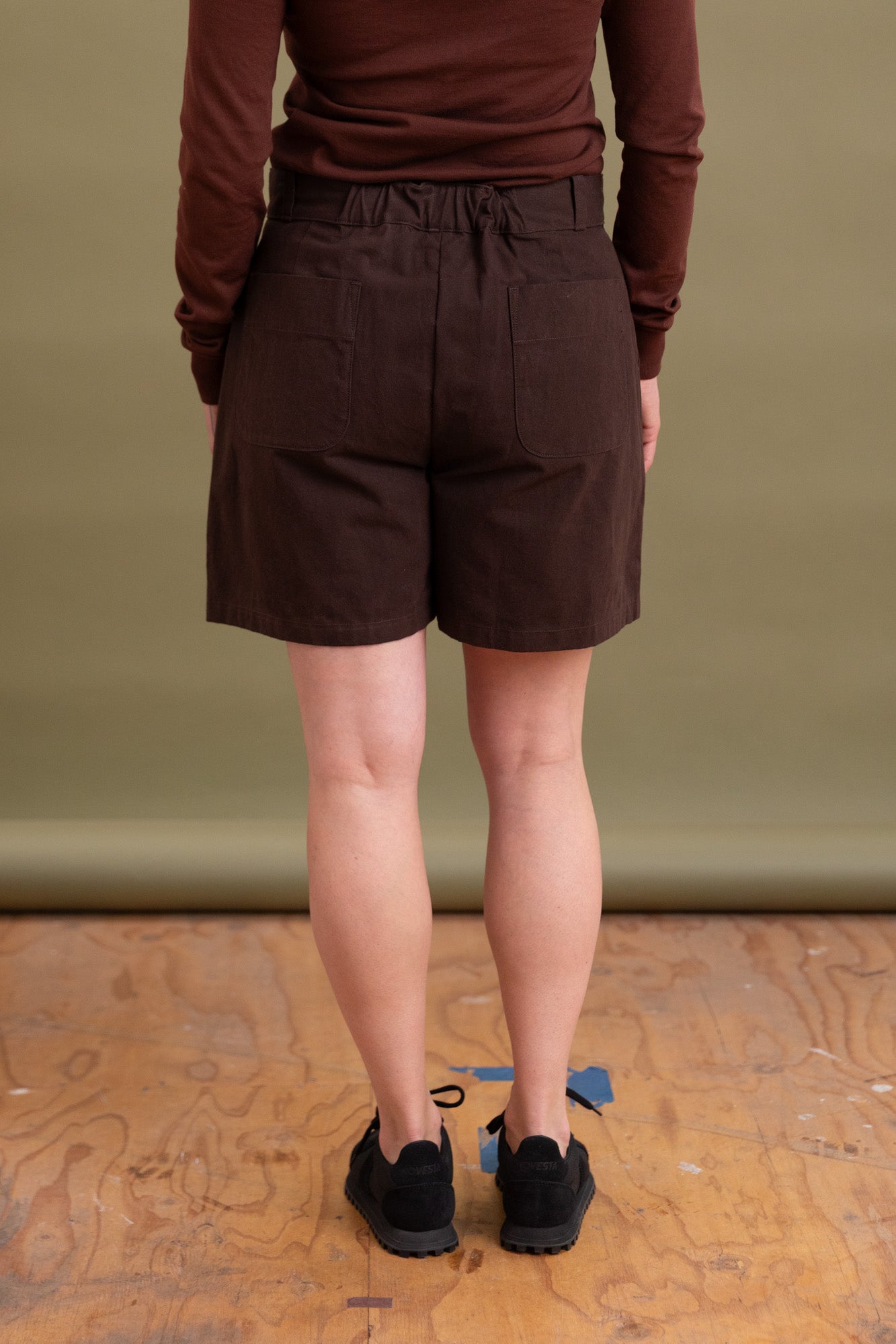 Shorts variation of the W-R0P4 "High-Wide Pants". Seat belt tape with adjustable button at the front, belt loops, elastic gusset at back, deep side pockets, and back patch-pockets. Made from yarn-dyed, high-density and heavyweight waxed cotton that will soften and develop character with time and wear.