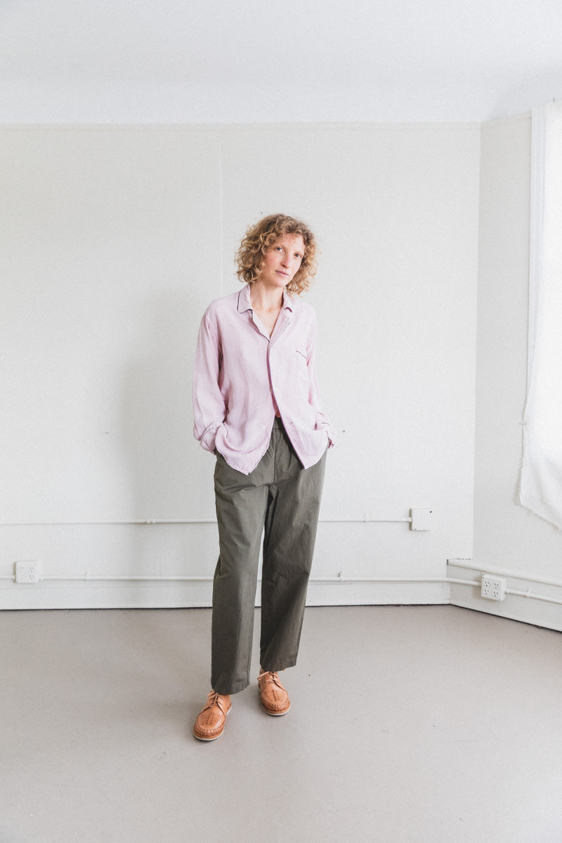 A vintage 1930's-40's rayon pajama top in a pink/purple color with maroon piping. A few splatters, repairs, loose threads and patches add to the charm of this shirt.